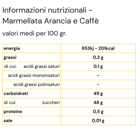 Arance, Zucchero, Succo di Limone, Chicchi di Caffè. Senza glutine e senza lattosio.
