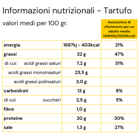 Ingredienti: anacardi biologici, acqua minerale, sale marino, fermenti, aroma al tartufo. Senza glutine e senza lattosio.